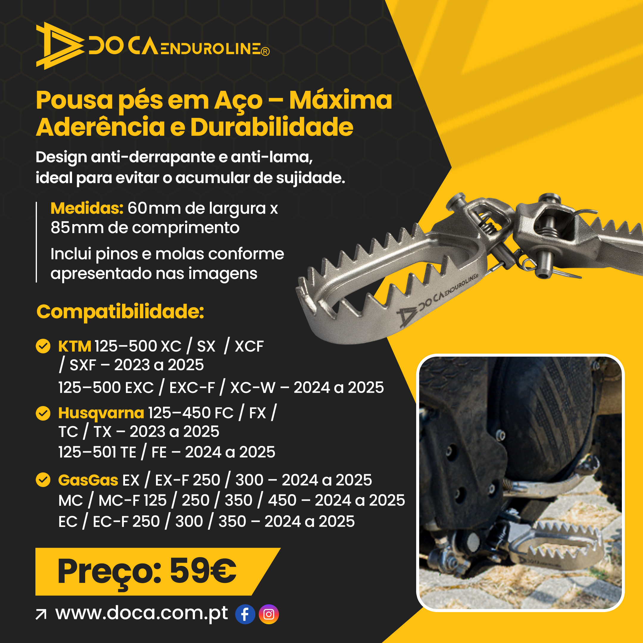 Os Pousa-pés em Aço DOCAenduroline foram desenvolvidos para pilotos que exigem controlo absoluto da moto, especialmente em enduro técnico e hard enduro.